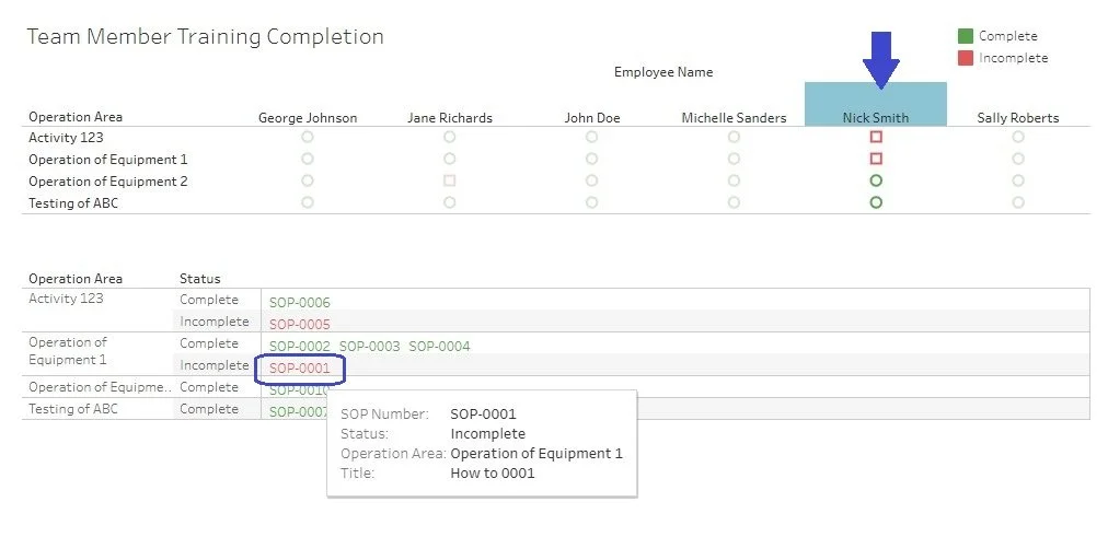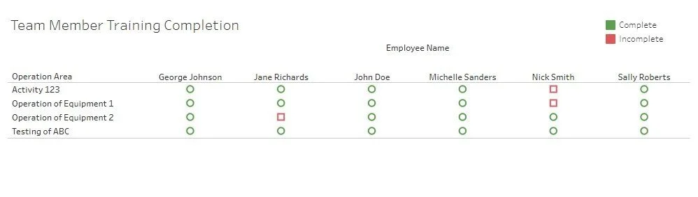 Tableau is a powerful visualization tool that can be used to create impressive visualizations for use as either as a one off presentation of a data set or as a connected real time dashboard with integrated links to data sets in other systems or cloud locations. I used Tableau to create a tool that transformed specifically selected training completion information from the learning management system report data to a dashboard. This visualization helped turn a spreadsheet full of data into a easy to digest visual showing which team members were cleared to execute specific operations that day. By incorporating action filters and tool tips this dashboard can be used to drill into more individual details as needed.